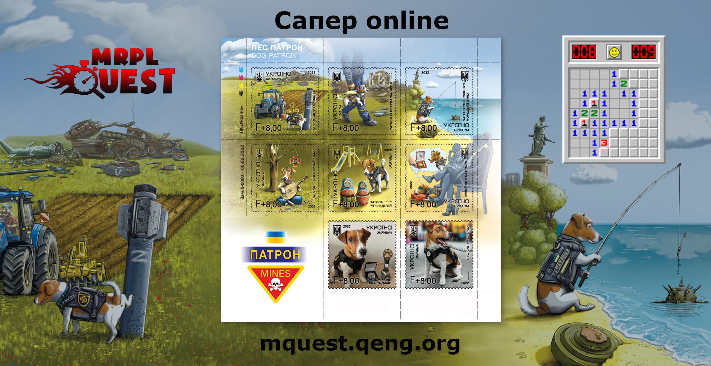 Розмінування звільнених територій - це серйозна проблема сьогодення. В грі вам треба буде допомогти псу Патрону розмінувати по черзі 3 території - поле 5х5, населений пункт 6х5 та море 6х6. Розв'язуючи логічні завдання, ви будете відкривати ділянки з цифрами і за принципом всім знайомої гри в windows "Сапер" знаходити і знешкоджувати міни біля них. Гра натхненна тривалою боротьбою українського народу та вчорашнім святом. Тому тематика завдань - актуальні події за цей рік, меми, особистості, культура наша і наших союзників. Рекомендуємо грати з комп'ютера, з мобільних девайсів буде складніше і не так красиво, але теж можна. Мова гри: українська, там де резонно відповіді продубльовані на русском або in english, на логіку рішення мова впливає в небагатьох випадках. Складність суб'єктивно - нижче середньої (можливо - середня), середній час проходження 1-2,5 години. Подробна інструкція по грі ТУТ і в стартовій заглушці.