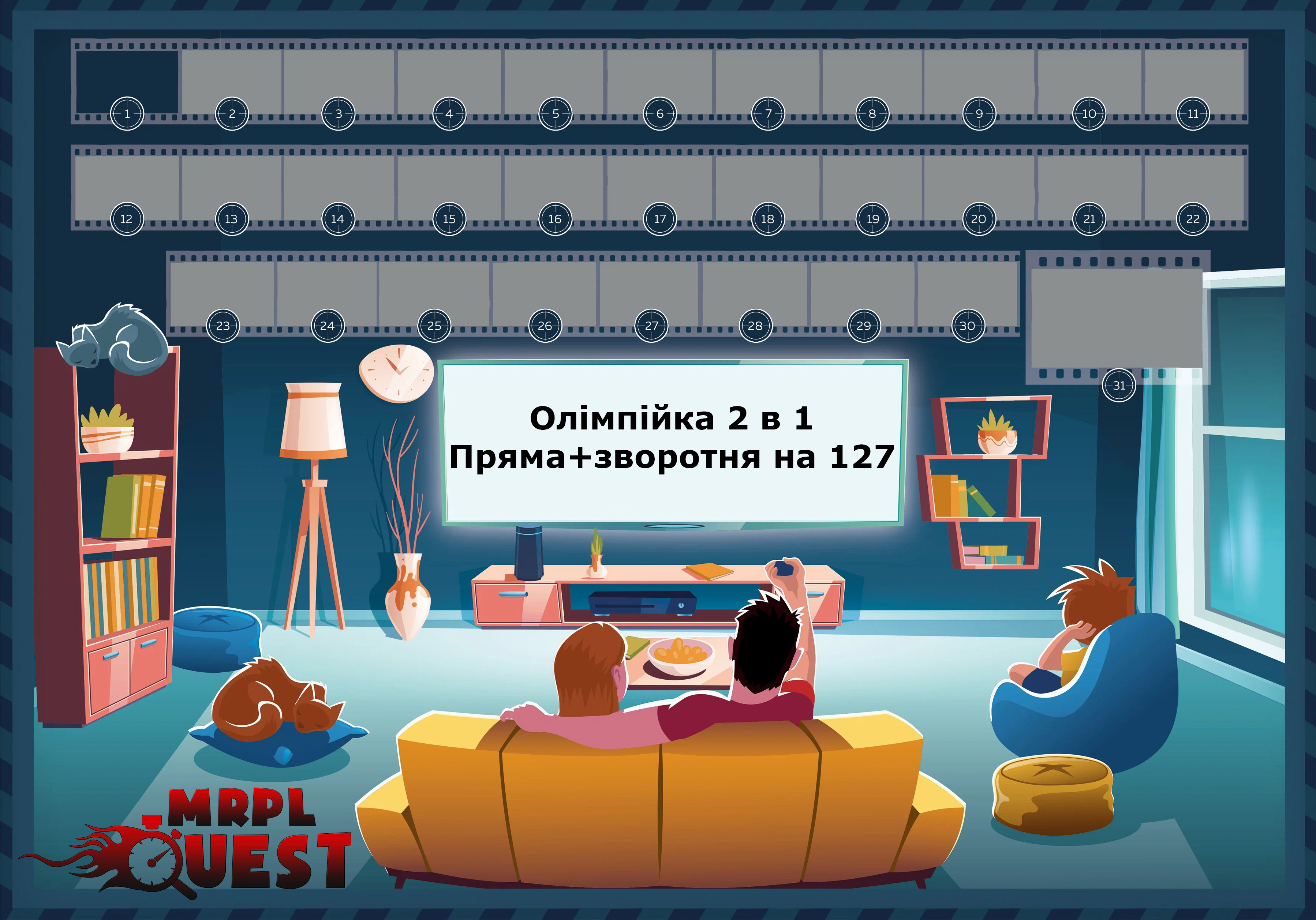Якась навала ігор з кінотематикою відбулась останнім часом. Вирішили і ми зробити останню спробу на нескладну олімпійку з ухилом деяких секторів в кінотематику. Гра мала вийти тиждень тому, але все пішло шкереберть. Тож вже зараз пропонуємо зіграти в олімпійку на 127 секторів з прямою і зворотньою механікою одночасно. Верхня половина олімпійки - пряма, де стартові 32 сектори будуть загадані текстом теж за принципом олімпійки і пов'язані з кіно, як і верхівка олімпійки, з якої перейдете до нижньої половини в зворотньому форматі (там вже про кіно майже не буде). Опис формату ТУТ. Для гри не треба бути кіногуру, завжди є гугл, без якого навіть інколи буде важко обійтись. Мова гри: українська, всі відповіді продубльовані на русском, но на нем будет сложнее. Складність суб'єктивно - нижче середньої, старався не упорюватись, коди можна докупляти за штраф. Тривалість: ~45хв-2год, автоперехід через 3 години.